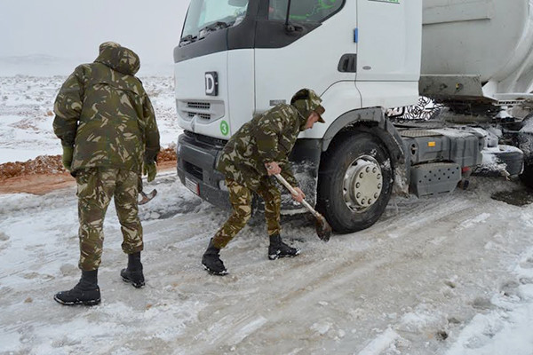 وحسب بيان صادر عن وزارة الدفاع الوطني فإن جهود الجيش متواصلة لليوم الثاني على التوالي يتواصل تدخل مفارز الجيش، ووحدات الدرك الوطني بإقليم الناحية العسكرية الثانية، لفتح الطرقات التي أغلقتها الثلوج، وتقديم يد المساعدة والإعانة المادية والعينية من مواد غذائية وطاقوية، إلى المواطنين الذين يجدون صعوبات في التنقل والتموين.