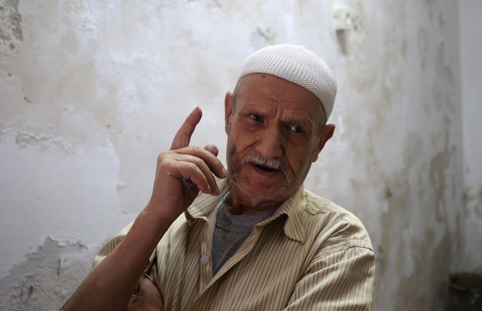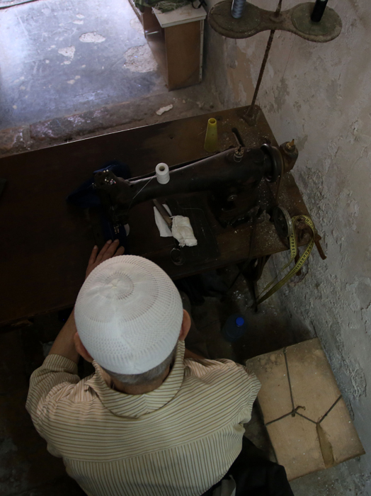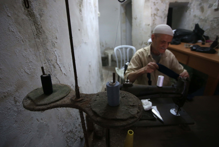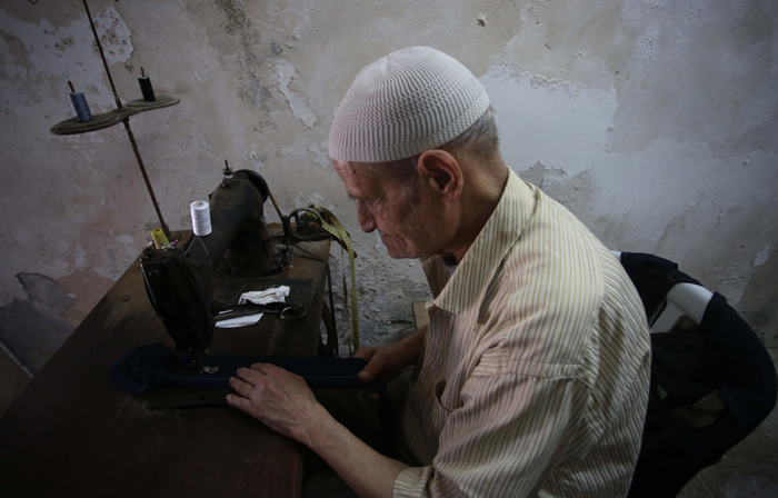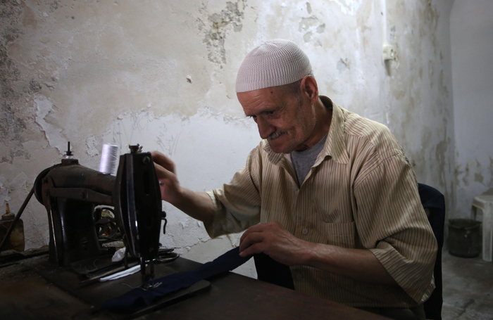 الخياط الثمانيني أسعد السويس خلال عمله في محله في البلدة القديمة في نابلس
