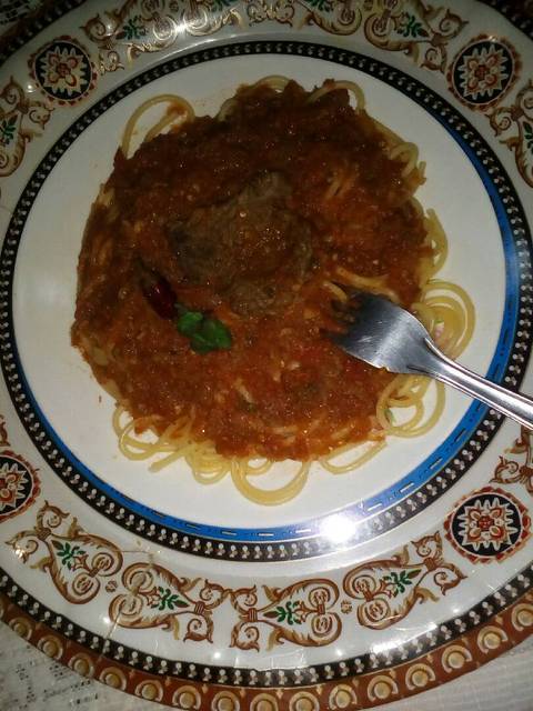 نضع السباغيتي في صحن التقديم ونسكب الصلصة اللذيذة ونزينها حسب الرغبة، وشهية طيبة